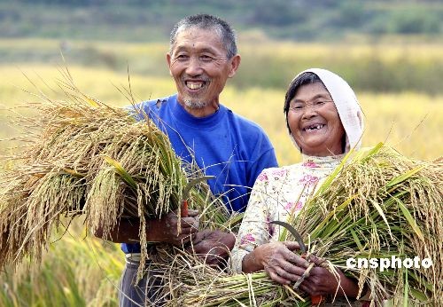 2008年10月,湖南永州市零陵区菱角塘镇坪头村迎来晚稻丰收时节,辛勤的庄稼人手捧金色收获,脸上绽开幸福笑容。中新社发 周承伟 摄