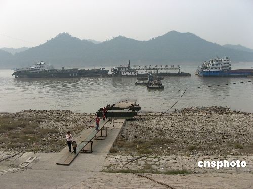 10月19日是湖北宜昌三峡二期160米蓄水的第三天,三峡坝前水位实现历史性突破达到156.09米,葛洲坝下泄流量为6590立方米/秒,宜昌水位1.18米。长江中游提前进入枯水期,江滩裸露,跳船搁浅,风筝起舞,呈现冬季特征。中新社发 韩玉洪 摄