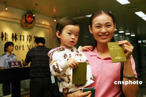 十月二十日十四点三十分,广西桂林两江国际机场口岸台胞签注点迎来第一名台胞莫小燕母女前来签注,桂林市公安局出入境管理处的工作人员不到十分种就为她们办好签注手续。当日,广西桂林两江国际机场口岸台胞台胞签注办公室正式启动。中新社发 唐艳兰 摄