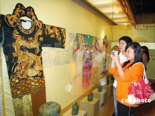 10月20日,南京市民正在南京博物院参观戏剧文物展。为配合在南京举行的第31届世界戏剧节,南京博物院首次举办了戏剧文物展,展出了从上万件馆藏品中和民间征集到的与中国戏曲有关的古代面具、古筝、弦子、青铜编钟、服饰和编磬等古乐器和皮影脸谱、皮影道具、舞蹈俑等中国戏曲文物近百件。中新社发 谷昌旺 摄