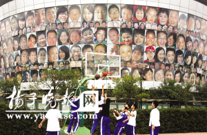 20日,南京金陵中学河西分校近400平方米的“笑脸墙”正式亮相,从校园征集的272个孩子的笑脸图被贴在学校餐厅三层圆弧形的玻璃幕墙上,成为江苏中小学校园最大的一面“笑脸墙”。 记者 张琳/文 宋峤/摄