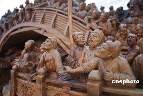 10月21日,长18米的巨型根雕《清明上河图》在开封东京艺术中心广场展出。据工作人员介绍,这一作品原木是一株生长在东南亚热带崇山峻岭中的香樟古木,树龄在2300年以上,树高百米,树干直径4米,根径20米,完全暴露风干近10年。后以北宋画家张择端的《清明上河图》为蓝本,由福建35位艺术家和工匠历时5年精雕细刻而成。雕刻完成后,作品长18米,高2.56米,宽2米,重12吨。 据悉,这一来自福建莆田的巨型香樟木根雕《清明上河图》作品,已经申报吉尼斯世界纪录。中新社发 刘书亭 摄