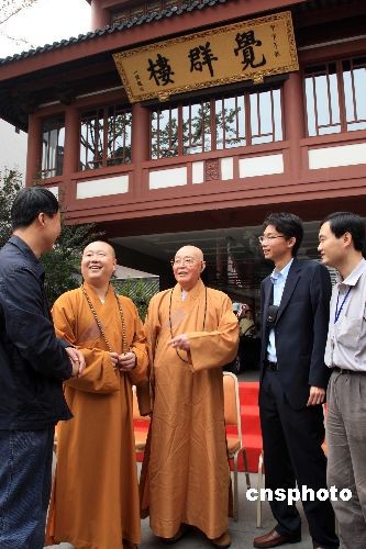 10月22日,高校佛学专家们与上海玉佛寺方丈觉醒法师(左二)、真如寺妙灵长老(中)参加“佛教与生态文明”学术研讨会。当日,“佛教与生态文明”学术研讨会在上海佛门圣地玉佛寺召开,中国高等院校著名学者、佛教界法师、居士数百人参会。中新社发 潘索菲 摄