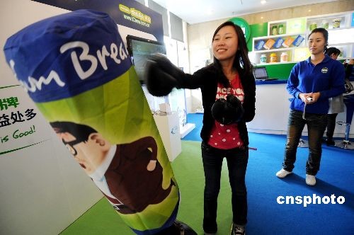 10月22日,白领进行对“老板头像沙包”拳打脚踢的体验。据悉,这个在沈阳登陆全方位的小休减压“嚼吧”,希望对于上班族随时随地舒缓压力、常葆健康正面的心理状态有所助益。中新社发 文契 摄