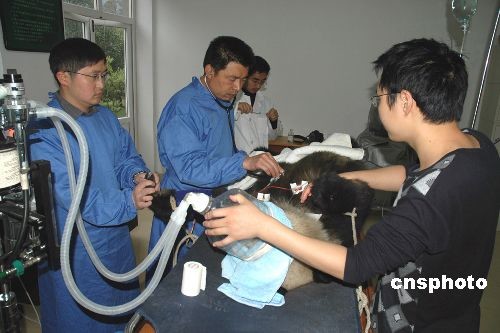 10月29日凌晨5点多,一只来自唐家河保护区的野生大熊猫因病进入了当地人的生活区域求救,被当地保护区管理处的工作人员送到中国保护大熊猫研究中心雅安碧峰峡基地兽医院救治。继10月26日卧龙救治一只野生大熊猫后,这是地震以后受灾地区发现的第二只野生大熊猫。图为工作人员在救治大熊猫。中新社发 罗小韵 摄