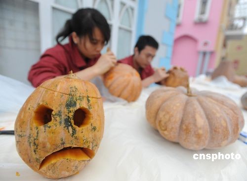 10月31日,是西方传统的“鬼节”万圣节前夜。白天,下着蒙蒙细雨的长沙处处寒意浓浓,长沙世界之窗工作人员正在雕刻的“毛骨悚然”的各式南瓜,让这个阴冷的节日多了几分“鬼”意。中新社发 肖前辉 摄