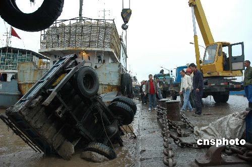 10月31日7时许,浙江省台州市水产品交易中心码头,一辆货车由于司机操作不慎,从码头上“失足”滑落到深约5米的江中。接到报警后,台州边防支队海门边防派出所立即调来潜水员和吊车实施营救,经过1个多小时的努力,终于将货车成功吊上码头。据边防民警调查了解,此次事故是由于司机下车后忘记熄火,挂着空档的车子自行滑落江中,幸未造成人员伤亡。中新社发 (郏策) 摄