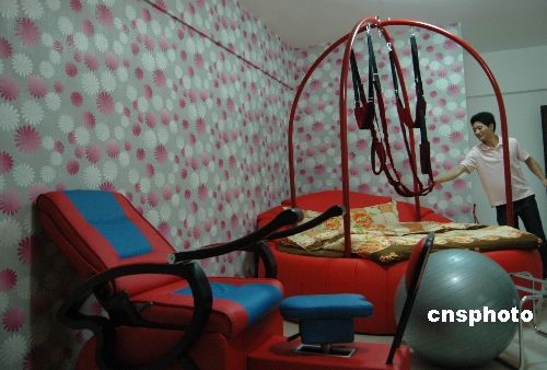 10月31日,广西南宁一家以“性趣”为主题的酒店试业,房内配置有圆形红床、电动椅、无重力性爱椅、性爱球等大胆前卫的器具,引来众多年轻男女预订。中新社发 王刚 摄