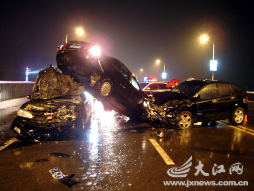 目击者说,当时他听见轰的一声后,回头看时这三辆车已经撞到一起,中间那辆别克轿车屁股高高翘到另一辆奇瑞小轿车的车顶上。十几分钟后,3辆车上的伤者被120急救车送走。事发后,交警在南昌大桥的两头设立警戒,一些公交车乘客步行下桥。交警称事发时视线不好,车速很快,事故原因还在调查中。记者 徐彬