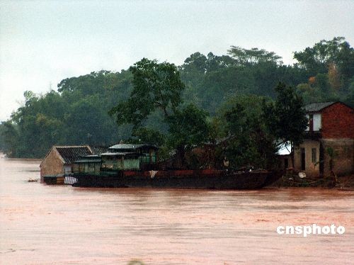 11月3日早6点,洪峰117.70米(超警戒水位0.50米)已经通过龙州县城,航运小区部分民房被淹,龙州沿江的乡镇龙州镇和上金乡的主要经济作物甘蔗、蔬菜等受淹,给即将收获的甘蔗质量造成很大的影响。中新社发 冯文 摄