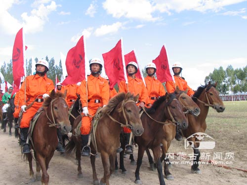 内蒙古自治区(西部)农村牧区消防教育培训基地及锡林郭勒盟白音锡勒马背消防队正式揭牌成立。这是全国首支由现役消防人员组成的马背消防队伍,也标志着内蒙古农牧区消防工作又迈出了一个新台阶。 (安华怡/摄)