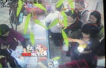 帖子中超市方监控录像上显示,在7点02分左右,网友“菲林篓”手举几瓶果汁来到7号收银台付款,刚接完一个朋友的电话,她把手机放在上衣的右袋里,手机链还露在了外面,这时3个不明身份的女子从后围在她身旁,一名黑衣女子站在最右边,用包挡住“菲林篓”右袋,左边一灰衣女子快速从其口袋中盗走手机,随手转移到中间扎着马尾辫的灰衣女子手中,两名灰衣女子很快逃离现场,黑衣女子假装四处张望,很快也离开了。