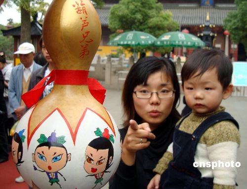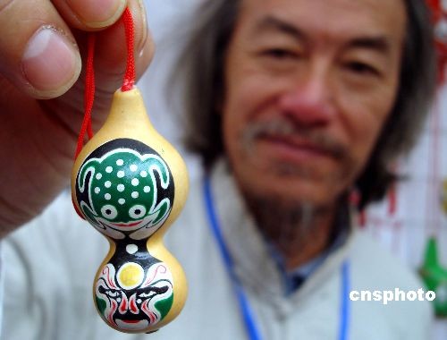2008年11月3日,苏州观前街民间工艺亭内,民间艺人王东元现场彩绘制作的“脸谱葫芦”,造型新颖别致,吸引了许多顾客的目光。中新社发 王建康 摄