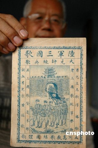 2008年11月4日,一本尘封80年民国年间出版的张作霖《大元帅练兵歌》在山东滨州无棣面世。该书1928年由天津河东特制、聚文山房发行。《大元帅练兵歌》唱的是民国共和,夸的是本军统帅,说的是当兵意义,真实记录了奉军出操、练兵、行军、打仗的场景。令人惊奇的是,被毛泽东反复推荐的红军歌曲《三大纪律八项注意》的曲调,竟是张作霖的《大元帅练兵歌》。中新社发 梁宝海 摄