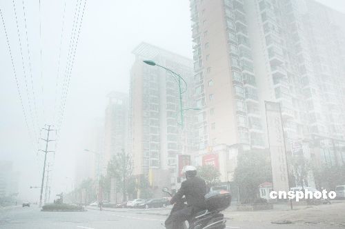 十一月六日清晨,一场大雾笼罩江西南昌,给行车和市民出行带来一定的不便。据江西省气象台今晨发布的大雾黄色预警信号:目前江西省南昌、抚州、赣州三地市已经出现大雾天气,局部还出现能见度小于二百米的浓雾,请驾驶员和市民出行注意交通安全。中新社发 段长征 摄
