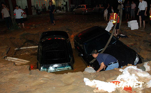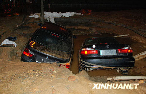 11月6日晚,广东清远市人民一路路旁发生地面塌陷,造成市区地下主供水管破裂,市区部分居民供水中断,两辆停在路边的小轿车也陷进坑内。事故发生后,清远市交警在塌陷坑的周围拉起安全警戒线,以防过往车辆陷入。供水公司迅速派人抢修供水管。目前事故原因正在进一步调查中。