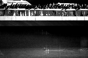 昨晚9点半,事发盘桥西侧的钢管护栏被撞开4米左右的豁口,轿车四轮朝天反扣在河里。水已把轮子淹没,从桥上望去,只能依稀看见车轮的轮廓。几名消防战士正从水里上到岸边。