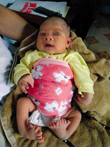 昨日中午,记者赶到南兴镇圩采访看到,婴儿活泼可爱,脚部弯向小腿内侧,左右两脚分别长了八个脚趾,十分整齐。从外形看,散开的八个脚趾就像一朵鸡冠花。记者还发现,该婴儿两手都长有五个指头,却没有大拇指。