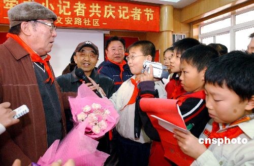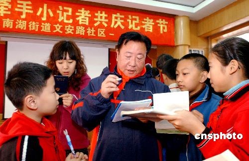 11月7日,沈阳市新闻工作者协会的十余名沈阳人民广播电台的离退休新闻工作者与文安路社区的小记者举办了“老记者牵手小记者共庆记者节”活动,老新闻工作者勉励小记者用镜头和纸笔,去捕捉家乡的新人新事新面貌,共叙祖国的繁荣富强,以此来迎接11月8日中国第九个记者节。中新社发 罗澜 摄