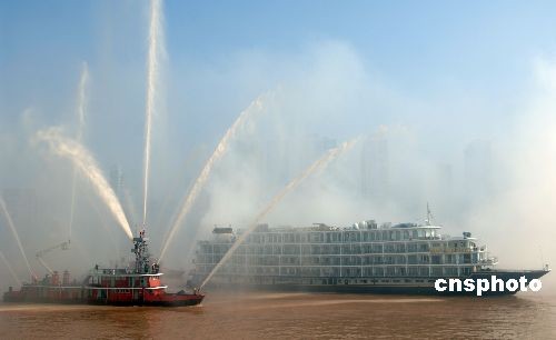 11月7日,由重庆市消防总队水上支队、重庆朝天门海事处、重庆市公安局水上警察总队、重庆东江实业公司等6家单位朝天门长江、嘉陵江交汇处联合举行长江大型旅游客轮火灾扑救演习。据称,此次演习旨在预防水上旅游客轮火灾事故,提高水上消防官兵和海事、水警等水上客轮火灾事故灭火救援的综合处置能力。中新社发 郭晋嘉 摄