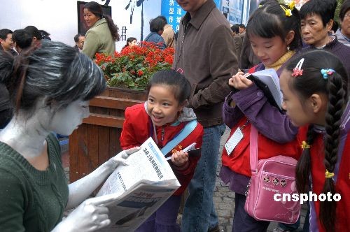 2008年11月8日是第九届中国记者节,江苏新闻界在南京市山西路广场举办“记者与人民群众心连心”大型广场咨询服务活动,众多小记者也来到现场,在捕捉新闻的同时,体验记者的辛苦和快乐。中新社发 阿董 摄