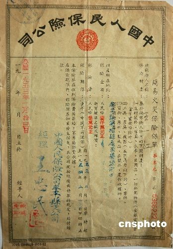 2008年11月8日,一张尘封半个世纪、签于1953年的保险单现身山东滨州无棣。该保单是“中国人民保险公司”的“简易火灾保险保单”,被保险人为王一红,山东牟平人,签于1953年2月13日。保险期为1953年2月13日至1954年2月13日,保险金额为3万元(相当于现在的3元),保险费则为1000元(相当于现在的1角钱)。中新社发 梁宝海 摄