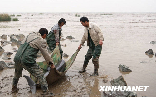 11月12日,3位渔民借助棉被将搁浅江豚转移到安全地带。 当日,在杭州湾海盐段滩涂,一条搁浅江豚在3位渔民的及时帮助下,重回大海。新华社发