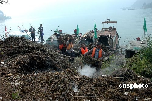 11月11日,长江三峡库区遭到自2003年蓄水以来最严重漂浮物袭击,船舶避让困难。海事部门沿江展开“战役式”突击清理打捞,督促检查,加强巡逻,使岸边浮物堆放点及时分类,快速处置,到目前为止没有发生漂浮物二次污染水体。中新社发 望作信 摄