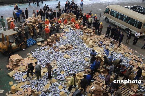 11月14日下午,近200吨问题奶粉在上海被焚烧厂销毁。上海市工商局、食药监局等百余名执法人员监督销毁全过程。这些问题奶粉均为今年9月三鹿牌婴幼儿奶粉事件发生后,在上海食品交易市场、超市、商场等下架封存、退货的问题奶粉。中新社发 潘索菲 摄