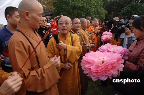11月17日傍晚,历时二天的第二届(武夷山)国际禅茶文化节,在僧俗序依依不舍中降下帷幕。图为文化节中,国茶---大红袍发源祖庭福建武夷山天心永乐禅寺方丈释泽道大和尚(左一),与高雄宏法寺高僧大德释传孝(左二)、福建佛教协会秘书长释本性大和尚(左三)、印度高僧释圆渡法师(左六)等一百零八位武夷山埠外高僧大德,为海峡两岸民众福址诵经祈福。 中新社发 郑祚声 摄