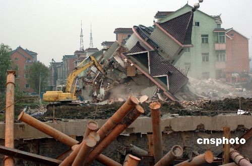 图:杭州地铁坍塌基坑东侧楼房被拆除