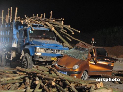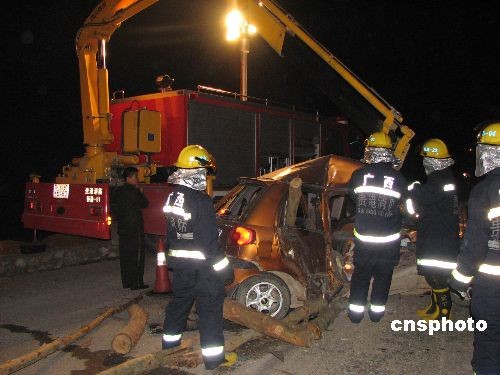 11月18日凌晨1时40分,广西贵港市东龙镇与武宣县交界处一辆满载木材的货车拦腰撞向一辆雪佛兰小轿车,木材散落一地,有几根还深深插进入了“雪佛兰”的车厢。贵港消防特勤大队6名官兵火速前往营救,至3时30分,车内被困女乘客安全获救。中新社发 李广永 摄