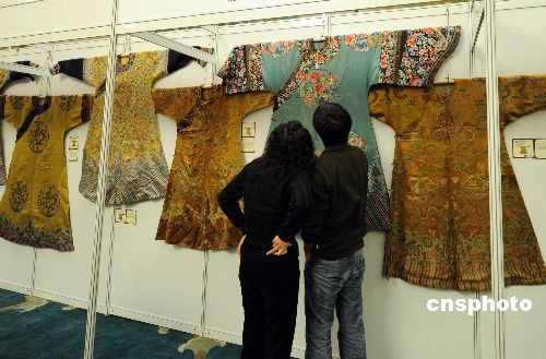 11月18日,2008“宫廷艺术品”高峰论坛在全国政协礼堂举行,北京北纬拍卖公司现场展出了包括9件清宫龙袍在内的20件宫廷艺术品。而北纬拍卖12月6日在北京专门为这批宫廷艺术品举行的专场拍卖会有近50件拍品,估价达2亿元人民币。中新社发 廖攀 摄