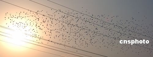 11月19日16时许,浙江省台州市东海大道与经中路路口上空呈现千鸟集翔的奇观。数千只全身乌黑、双翅有白斑的鸟儿绕路口上空翱翔两圈,犹如遮天蔽日的蝗虫。几秒钟后散去。 中新社发 陈远清 摄