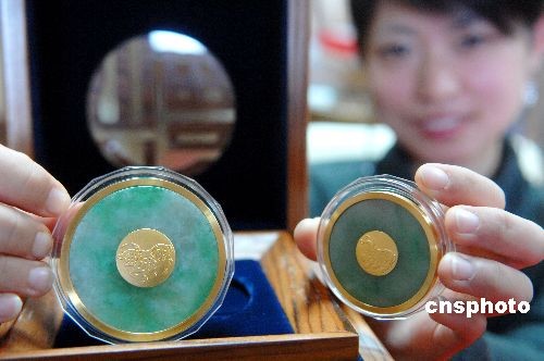 11月19日,工作人员展示金牛玉璧。由中国印钞造币总公司发行的金玉良缘生肖系列第三款——金牛玉璧即将于近日在北京菜百、工美等及中国银行各网点上市。金牛玉璧采用“可旋转金镶玉”的产品形式,采用特殊工艺将环形天然翡翠镶嵌至黄金底托中,玉可以自由旋转。产品分130克和40克两种规格,分别限量发行3000枚和6000枚。金牛玉璧正面中心部分微雕有一只中国传统剪纸风格的金牛,背面是一个中国书法“牛”字,一只憨态可掬的小牛藏匿于笔画之中。黄金和翡翠分别由中国印钞造币总公司和国家定点玉石检测中心提供鉴定证书。中新社发 远舟 摄