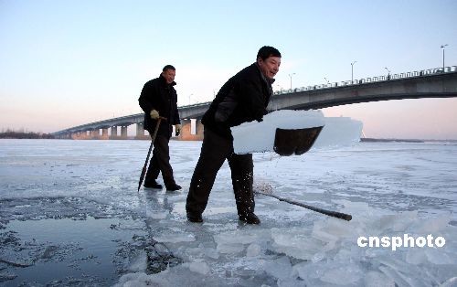 11月20日,哈尔滨公路大桥西侧黑龙江省冬泳协会冰窟池,游泳会长王利敏在冰窟窿里捞冰,准备按计划凿开一个长50米,宽20米的冬泳池。中新社发 姚庭山 摄