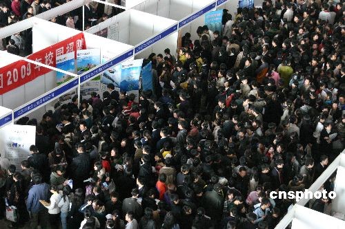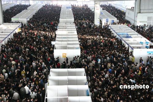 2008年11月20日,江苏省暨南京市2009届普通高校毕业生公益供需洽谈会在南京国际展览中心举行,参会的注册单位达942家,提供职位需求40152个,从网上投递简历中遴选出的5.2万名应届毕业生和数万名求职者入场应聘。由于应聘者众多,组委会分时段控制人员进场。中新社发 阿董 摄