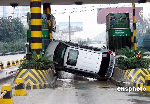 11月20日7时许,一驾驶员驾车从清镇往贵阳方向行驶,当行至贵黄公路金关收费站时,车辆突然失控冲向收费亭,在与收费亭外的安全岛水泥墩发生剧烈碰撞后,侧翻向收费亭飞去,在这危急时刻,幸好亭外的安全挡杆将该车牢牢卡住,使其横卧在收费通道内,没有进一步造成人员伤亡的恶果。事后,经现场民警调查,肇事原因是该车驾驶员晚上没有休息好,过收费站时太疲倦未控制好车,导致交通事故发生。中新社发 彭年 摄