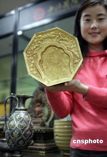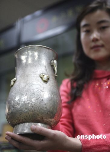 中拍国际秋季珍品拍卖会将于12月20日在北京亚洲大酒店举行,瓷器专场荟萃73件精品瓷器。其中高古瓷40余件,时代跨越唐至宋、元,涉及越窑、定窑、钧窑等老窑瓷。同时推出的22件金银器系列将是拍卖会上的亮点。图为12月2日,工作人员展示即将拍卖的珍品。中新社发 赵隽 摄