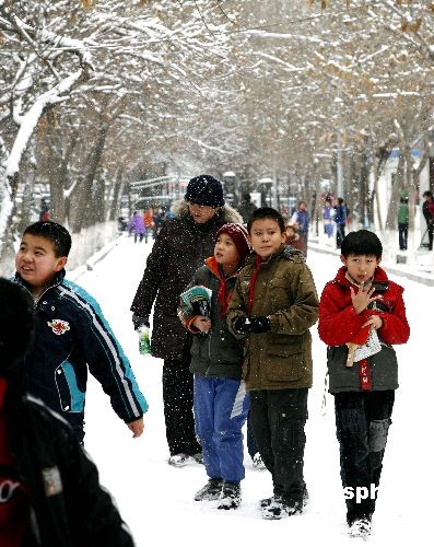 12月2日,新疆乌鲁木齐迎来第二次降雪,这是今年入冬以来首场较强的冷空气降温并夹裹纷纷扬扬的大雪袭来,放学的儿童们嬉笑玩耍在飘扬的雪花和清新的环境之中。中新社发 马蕙萍 摄