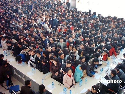 贵阳市某人力资源市场举行的首场招聘会上,前来求职的返乡农民工和大学生挤满了整个人才市场。经过精心筹备,使当天进场招聘的单位达80余家,提供保安、保洁、厨师、服务员、焊工、建筑等岗位800多个。由于近段时间从外省返乡的农民工不断增多,即将毕业的大学生和社会失业人员的求职需求也比较大,使得当天的招聘会异常火爆,进场招聘和求职的人员达到数千人,将人才市场挤得水泄不通。中新社发 彭年 摄