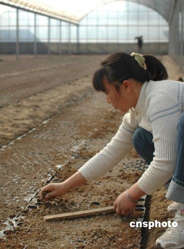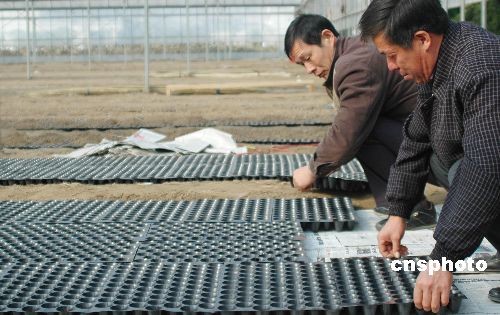12月2日,村民在大棚里为培育瓜苗做准备。眼下虽是冬闲时节,但安徽省芜湖市联群村格林合作社10亩科技大棚内却是一片忙碌,村民在农技人员的指导下,为明春第一茬冬瓜和西瓜培育瓜苗。据介绍,为保证瓜苗生长发育所需的足够温度,农技人员在大棚地里铺上绝缘电热丝,通电后,整个苗盘中的土壤就像披上一层 “电热毯”,种子“睡”在上面,这样即使在寒冬也照样能长出优质瓜苗。中新社发 陈立希 摄
