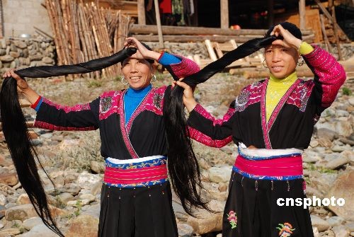 12月3日,广西龙胜各族自治县黄洛寨红瑶长发嫂在向中外游客展示其秀美长发。黄洛寨自古以来,红瑶妇女就有蓄长发的习俗,全村68户人家中头发长达1米以上的有60多名,最长的有1.7米,是世界上独一无二的长发村。中新社发 周利朔 摄