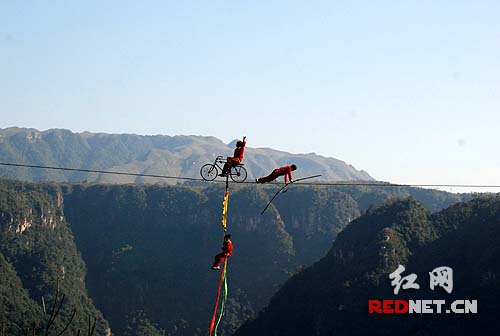 红网12月3日讯(记者 张树忠)记者近日在广东大峡谷,见到有人在高空钢丝上做俯卧撑。那可是一不小心就要坠入200余米谷底的活计!