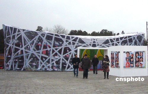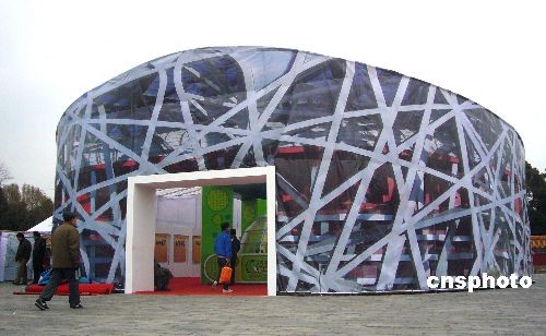 2008年12月3日,由喷绘布模拟搭建的山寨版“鸟巢”展厅正式在北京地坛书市的方泽坛活动区亮相,游客竞相入内参观。不过这个建筑可不是用来进行体育比赛的,本届书市的展览、法律咨询等活动都在这里进行。中新社发 玉龙 摄