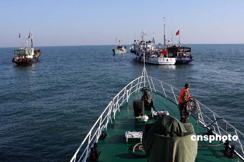 12月2日凌晨4点40分,浙苍渔运309号在舟山朱家尖岛东南海域航行时,被一货轮拦腰相撞,渔船随即迅速进水沉没,船上共有8人。截至目前为止,船上1人被救起,7人下落不明。图为海警、海事、渔政等部门接到报警后,相继到附近海域进行搜救。中新社发 何蒋勇 摄