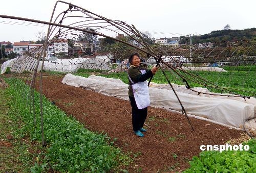 2008年12月4日,宜昌市郭家岭村四组农民在整修被大风损坏的蔬菜大棚。受北方强冷空气南下影响,当日凌晨,湖北宜昌地区出现寒潮、大风天气。该市已启动重大气象灾害Ⅲ级应急响应(寒潮、大风),气象部门提醒群众注意冰冻天气对越冬作物不利影响,加固蔬菜大棚,做好蔬菜的防冻保暖工作,部分不耐冻蔬菜要及时转入保护地栽培和维护,加强中晚熟柑橘采收与贮藏。中新社发 刘君凤 摄