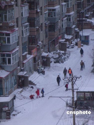 2008年12月4日,齐齐哈尔市再次降雪,城市银装素裹。当地气象台发布蓝色寒潮预警信号,提醒市民做好预防寒潮准备。齐齐哈尔市已经连续两天降雪,降雪给城市交通带来了不便,车辆纷纷缓行,市民忙着清扫道路上的积雪。中新社发 王云龙 摄