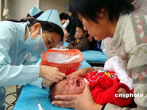 2008年12月4日,苏州市儿童医院的医护人员在为患儿输液。当日,受北方冷空气影响,苏州气温大幅下降,来医院就诊的患儿也比平时增加四成左右,大部分患儿是由于受凉而引发感冒、发烧等不适。中新社发 王建康 摄