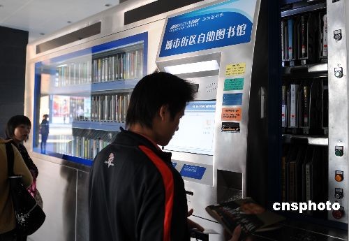 十二月九日,工作人员为深圳街头的自助图书馆补充图书,该设备无需人员值守,造型酷似提款机。中新社发 廖攀 摄